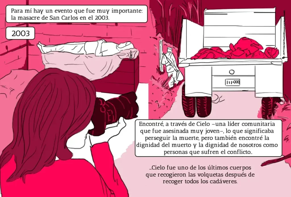 En el camino profesional comprendió que las imágenes del acontecimiento eran importantes, pero que no se comparaban con las que se podían lograr acompañando a las víctimas en su dolor, en la búsqueda de una verdad. En tono reflexivo asegura que “la imagen se vuelve en ese testimonio fehaciente de que sí sucedieron los hechos (…) sí hubo víctimas, sí hubo muertes, sí hay un conflicto armado. La fotografía no puede mentir”.
